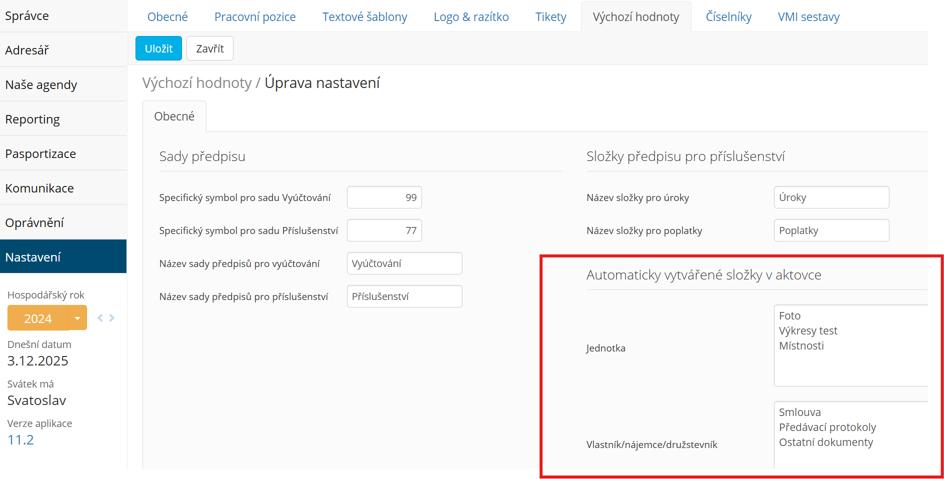 Chcete do všech jednotek či nájemců vytvořit složky hromadně? V modulu Správce-Nastavení-Výchozí hodnoty dejte Upravit a zadejte názvy složek jako seznam a po uložení klikněte na Vytvořit všem. Složky se vytvoří všem záznamům (jednotky nebo vlastník/nájemce/družstevník pokud neexistuje složka stejného jména. Hromadné vytvoření nelze vrátit zpět.