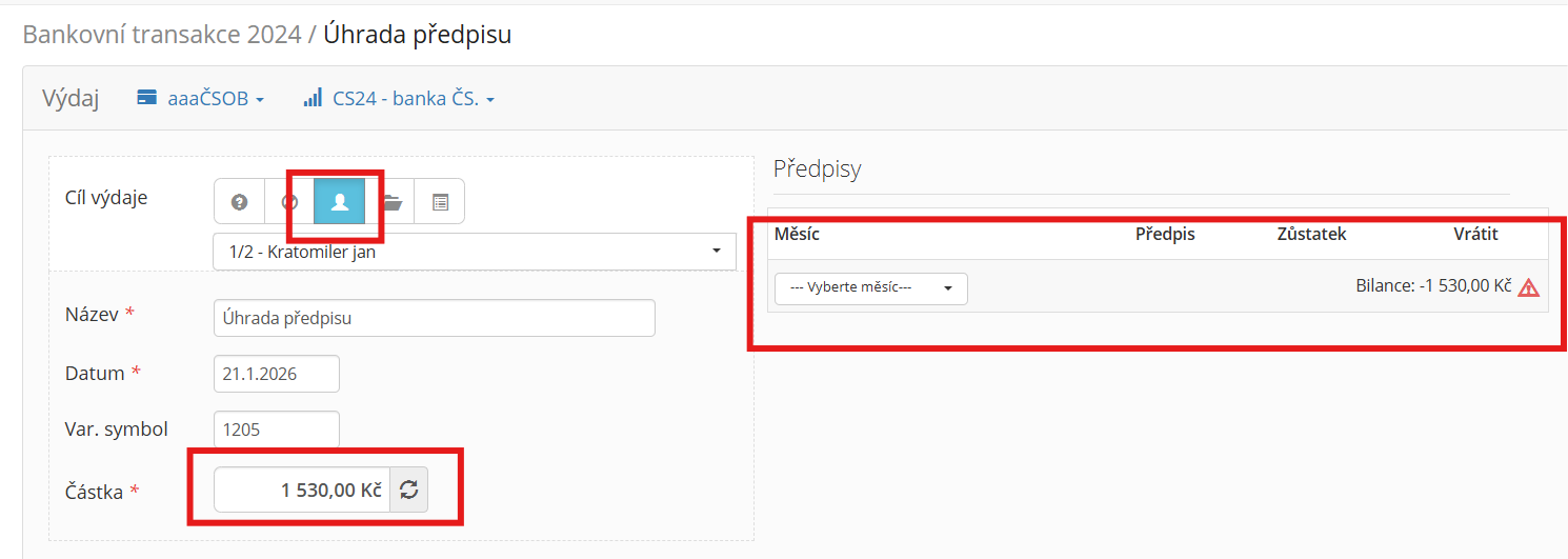 Přijaté úhrady od vlastníků/nájemců jsou párovány v transakcích pořízených v Finance->Banka/Pokladna. Zde k částce úhrady přiřazujete předpisy, které mají být uhrazeny. Úhrada předpisu může být jen do neuhrazené výše předpisy. Tedy k předpisu nelze napárovat vyšší částka než je dlužná. Předpis nelze přeplatit. Zaplatí-li vlastník/nájemce vyšší částku, pak je třeba přiřadit některý z dalších neuhrazených předpisů nebo "přeplatek" ponechat na kontě. Částka bude ponechána na kontě v případě, že bude uvedena jako kladná v údaji "Bilance".