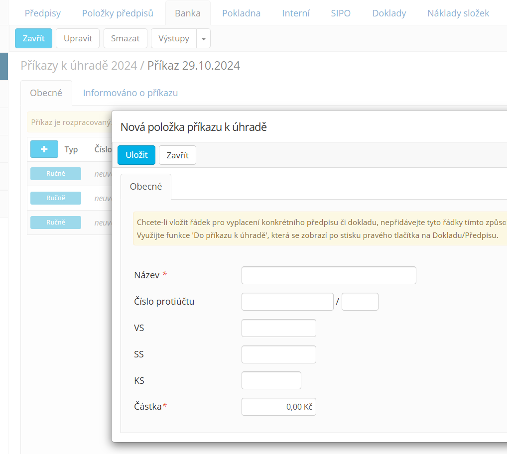 - Chcete zahrnout vrácení konta do příkazu k úhradě? Pak ve Finance-Banka-Příkazy k úhradě vytvořte nový příkaz či rozklikněte stávající rozpracovaný a ikonou + přidejte řádek, do kterého vyplníte potřebné údaje k provedení příkazu.