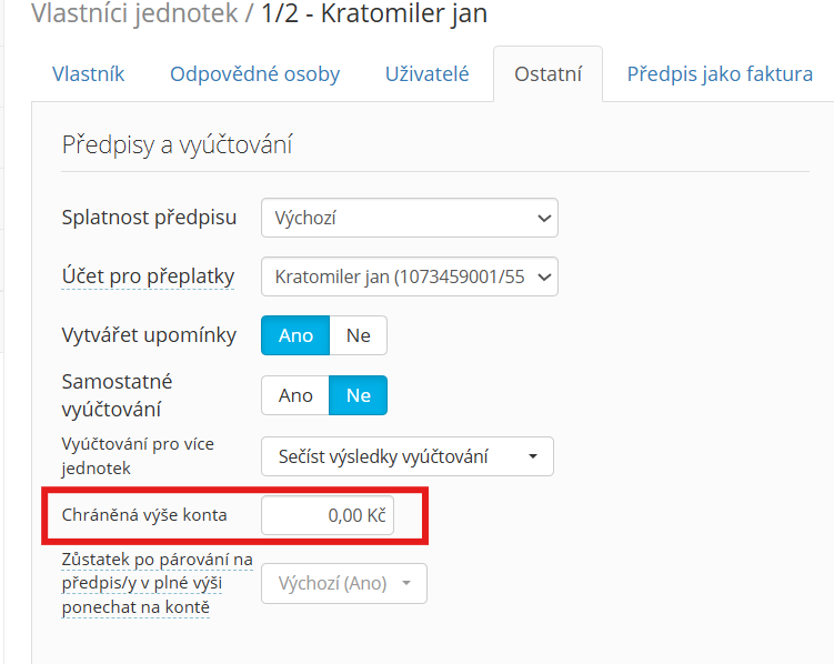 2. Pokud ipřesto chcete konto před vytvořením ročního vyúčtování vrátit, pak jej vyplaťte a vyplacenou částku, která se týká předchozího roku nastavte vlastníkovi/nájemci jako chráněné konto (taková částka po té do ročního vyúčtování nebude zahrnuta a nestane se, že konto vyplatíte 2x - jednou přes účet/pokladnu a podruhé ročním vyúčtováním)