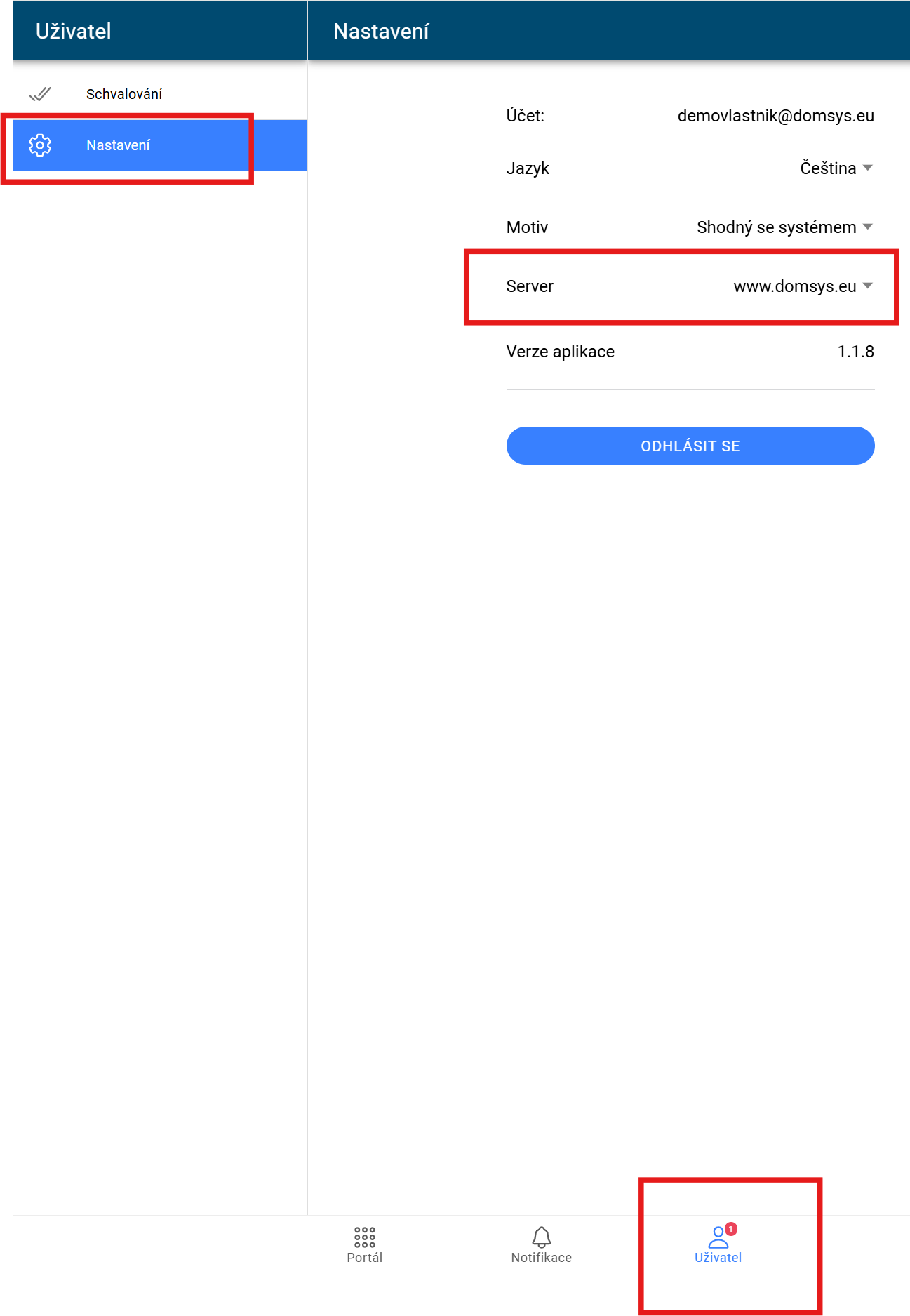 Pokud uživatel má v rámci portálu přístup k více nemovitostem s různými správci, pak v případě, kdy některý správce nepoužívá adresu www.domsys.eu, je potřeba pro zobrazení jím spravových nemovitostí změnit v mobilní aplikaci server a to v Uživatel-Nastavení-Server.