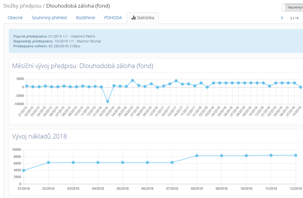 - Pro představu vývoje finančních toků byly přidány grafy (např. k měřidlům vývoj spotřeb, u účtů vývoj stavu financí, ve složkách předpisů přehled předpisů a evidovaných nákladů).