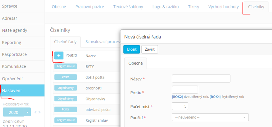Smlouvy můžete vytvářet očíslované v číselné řadě, kterou v šabloně určíte. Aby bylo možné číselnou řadu vybrat, nejdříve ji vytvořte v modulu Správce-Nastavení-Číselníky-záložka Číselné řady, kde řadu přidáte pomocí tlačítka + a určíte, že bude použita pro Registr smluv.