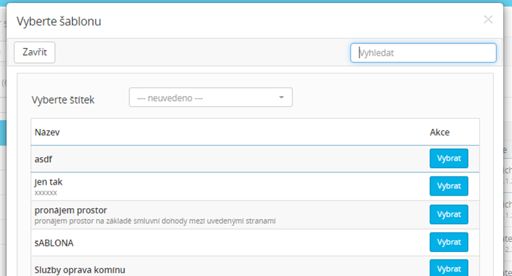 Po kliknutí na Nová smlouva vyberte šablonu smlouvy a zvolte Vybrat (uživatelům můžou být nabídnuty jen vybrané šablony. Toto nastavíte v Naše agendy-Šablony smluv a po kliknutí na vybranou šablonu použijte Další-Oprávnění uživatelů, kdy vyberete uživatele, kterým se šablony ve smlouvách nabídne).