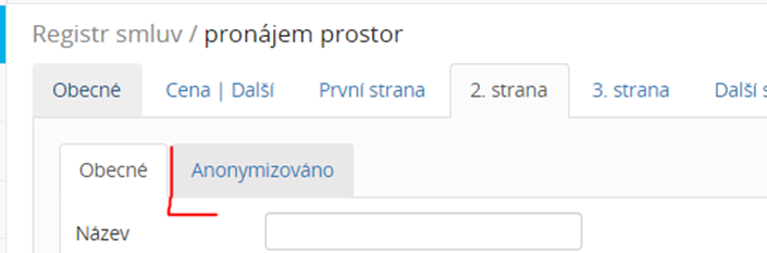 2. strana/3. strana/Další strany – uveďte zde protistrany uzavírající smlouvy. Na těchto záložkách naleznete záložku Anonymizováno, do kterého vyplníte pouze údaje, které mají být zveřejněny