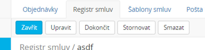 U takto vytvořených a uložených smluv můžete evidovat jejich stav. Dvakrát smlouvu rozklikněte (nebo použijte tlačítko Otevřít) a vyberte co se má se smlouvou stát – pomocí tlačítek Dokončit, Stornovat nebo Opravit v případě, že smlouva je již dokončená.