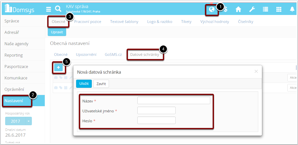 - V modulu Správce->Nastavení->Obecné->Datové schránky- zde zaevidujte přístupové údaje ke všem datovým schránkám, ke kterým máte právo pro odesílání zpráv.