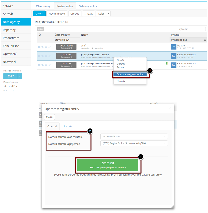 Smlouvy ke zveřejnění je třeba evidovat v modulu Správce->Naše agendy->Registr smluv.