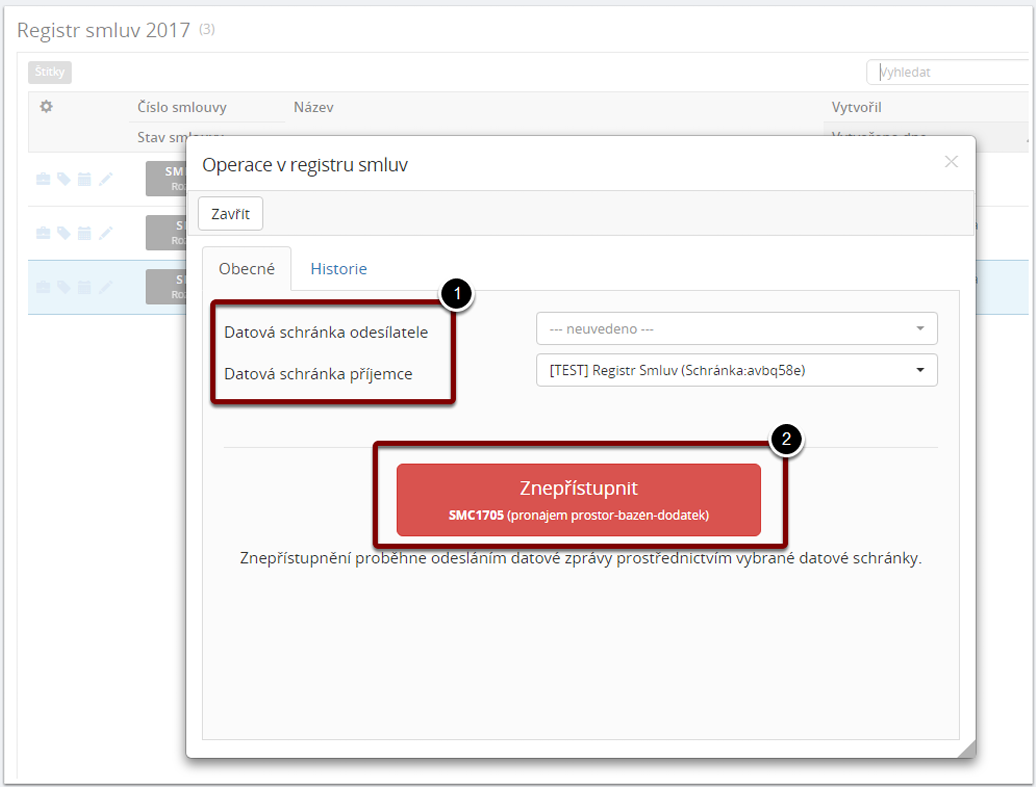 Záznam, který jste odeslali do registru smluv a je zveřejněn, lze také znepřístupnit. Znepřístupnění provedete stejným postupem jako zveřejnění, tedy pomocí nabídky pravého tlačítka myši->Operace v registru smluv.