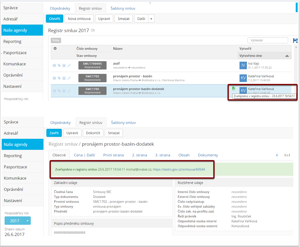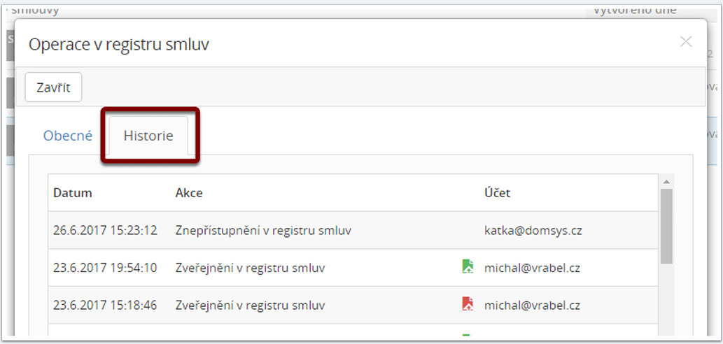 Chcete-li jednoduše zjistit, co vše bylo přes datové schránky se záznamem provedeno, stačí znovu použít nabídku pravého tlačítky myši->Operace v registru smluv a podívat se na záložku Historie.