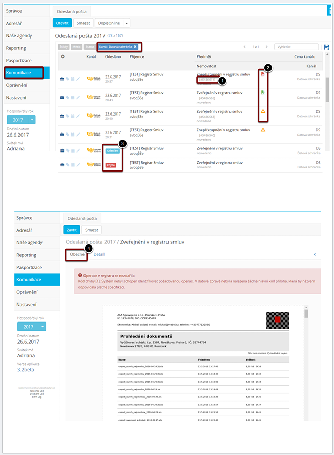 Všechny zprávy zaslané pomocí datových schránek naleznete v modulu Správce >Komunikace či v modulu Nemovitost->Komunikace->Odeslaná pošta a to včetně podrobnějších informací o zpracování. U každé zprávy je uvedeno tzv. číslo datové zprávy, pod kterým byla zpráva zaevidována v datové schránce (1).