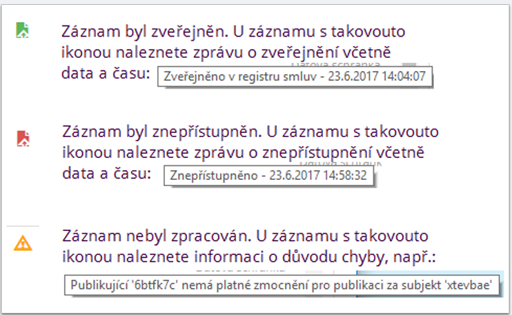 Na objednávkách, smlouvách či v komunikaci jsou k dispozici tyto ikony znázorňující zpracování záznamu v registru smluv.