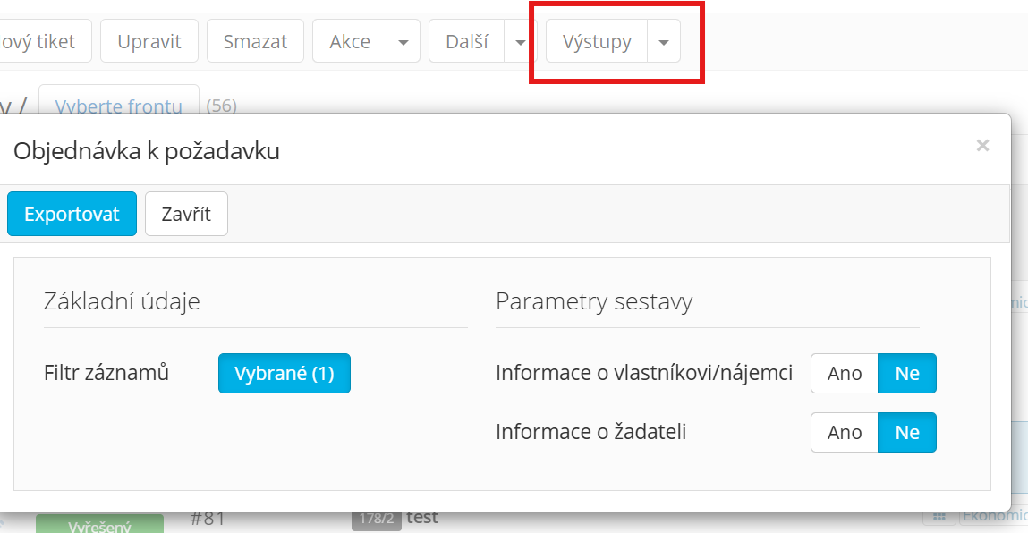 V modulu HELPDESK lze k evidovanému tiketu (požadavku) vytvořit výstup objednávky.